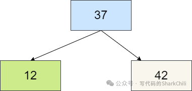对此我们就需要进行一个右旋的操作,如下图,因为红黑树的有序性,这使得42这个根节点大于左边的所有节点,所以我们将左节点中最大的节点作为42的左节点,让37作为根节点,完成黑平衡,如下图。