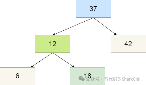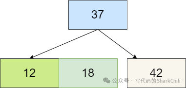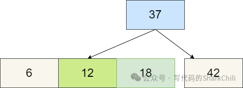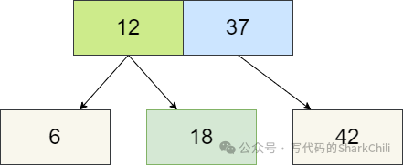 在添加18,比37小,比12大,所以要插入到12的右子节点,但是右子节点为空,所以18就和12合并变为3节点