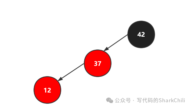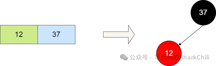 前文我们提到红黑树可以理解为2-3树的另一种变体,我们以2-3树的2节点为例,对应成红黑树的标识就是将2节点的左边染红并作为右节点的子节点,注意,笔者这里虽说12作为37的子节点,但是在红黑树的性质中,这两个节点逻辑上可以理解为一个节点,这样的理解便于我们后续了解红黑树的黑平衡。