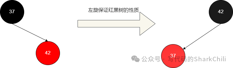 若是红黑树,42和37进行比对之后发现,42大于37,最终42就会以右子节点的姿态在37的右边,很明显这违背了红黑树的特征,所有的红节点都必须位于左节点。所以我们需要对其进行左旋,并将右上节点染黑,左下节点染红。