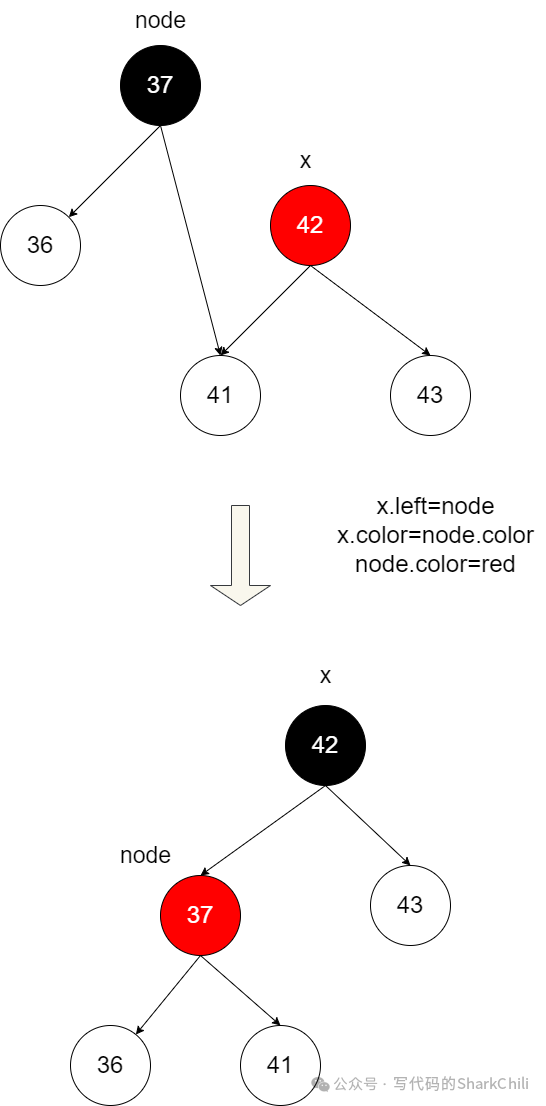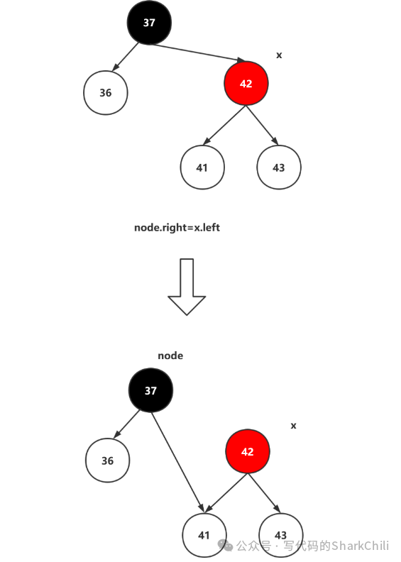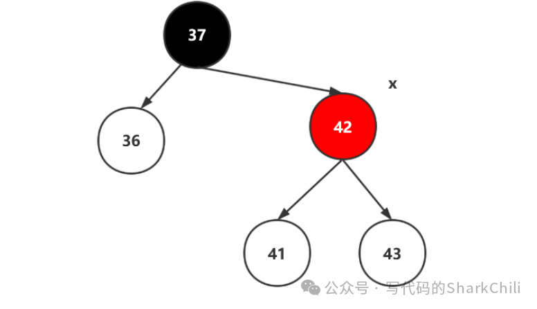 所以我们需要进行一次左旋转,因为红黑树的性质保证黑节点37的右子树都大于37,所以左旋时,先找到红节点42的最小节点作为37的右子节点,于是37指向41: