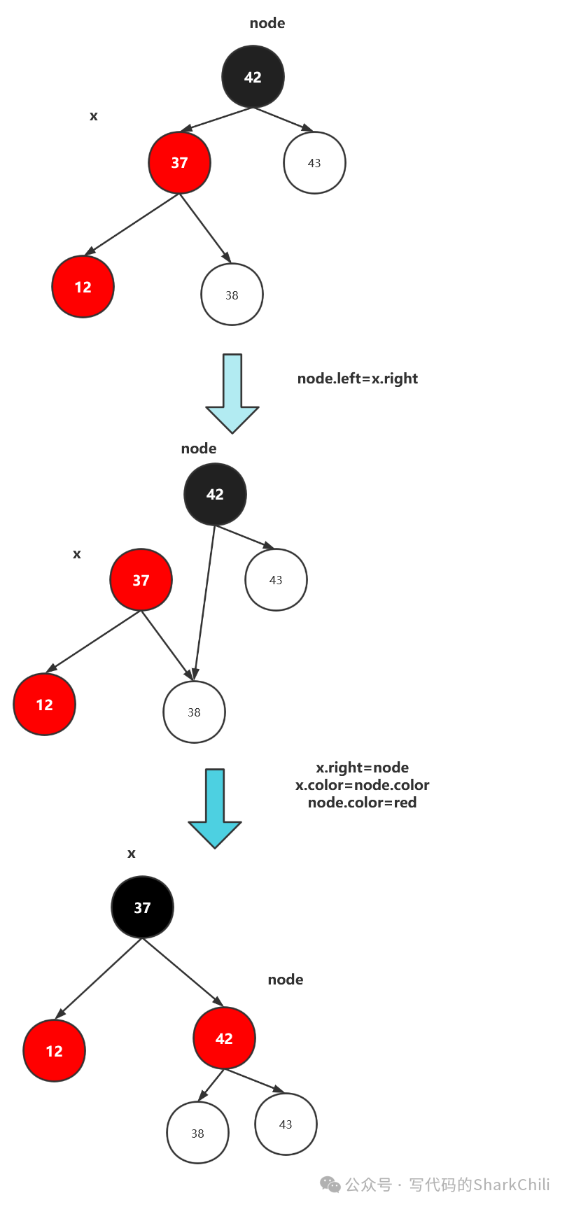 可以看到虽然完成了右旋转的操作,但是最终的左右节点都是红的,导致红黑树并不是黑平衡的,所以这里就需要一次颜色翻转。这里我们先贴出右旋转的代码,在介绍颜色翻转逻辑: