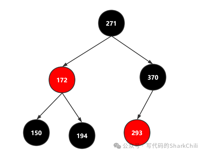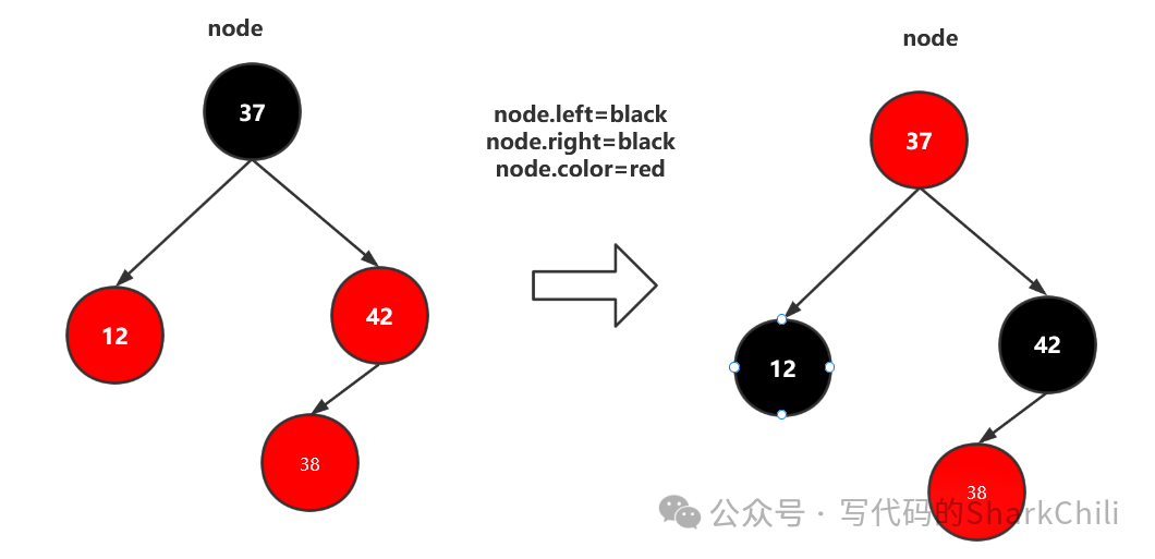 在上文右旋操作导致,颜色错误进而出现红黑树违背黑平衡的情况,所以我们需要进行颜色翻转,如下图,我们将子节点都为红的节点染黑,再将父节点染红(父节点会将笔者后续的递归逻辑中变黑)。