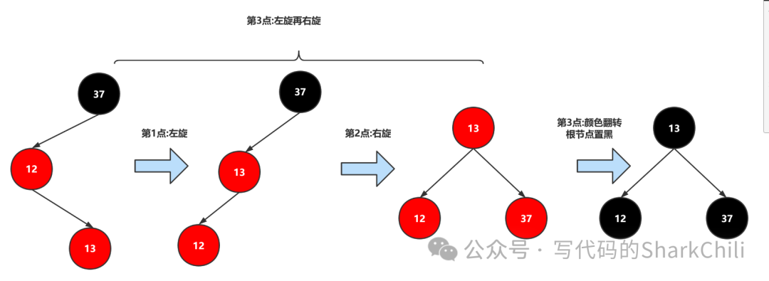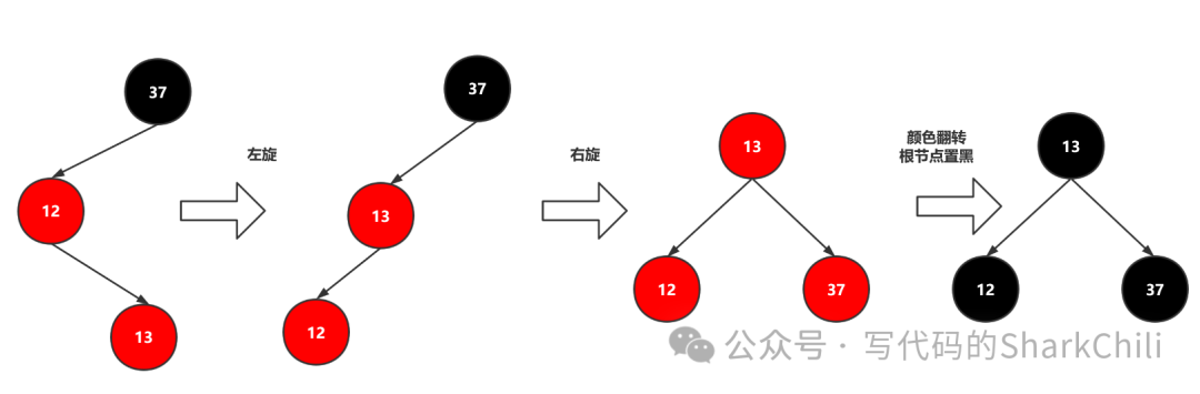 如下图,LR型就是37 12 13这样的插入顺序,对此我们只需左旋再右旋最后颜色翻转一下即可