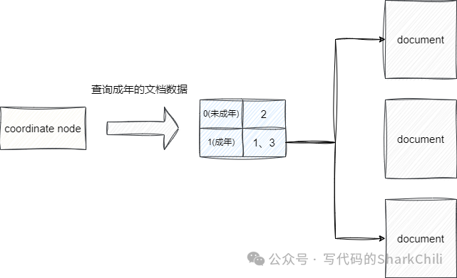 用0表示未成年1表示成年,从而通过词项走倒排索引完成数据检索,以避免范围查询开销快速获得数据: