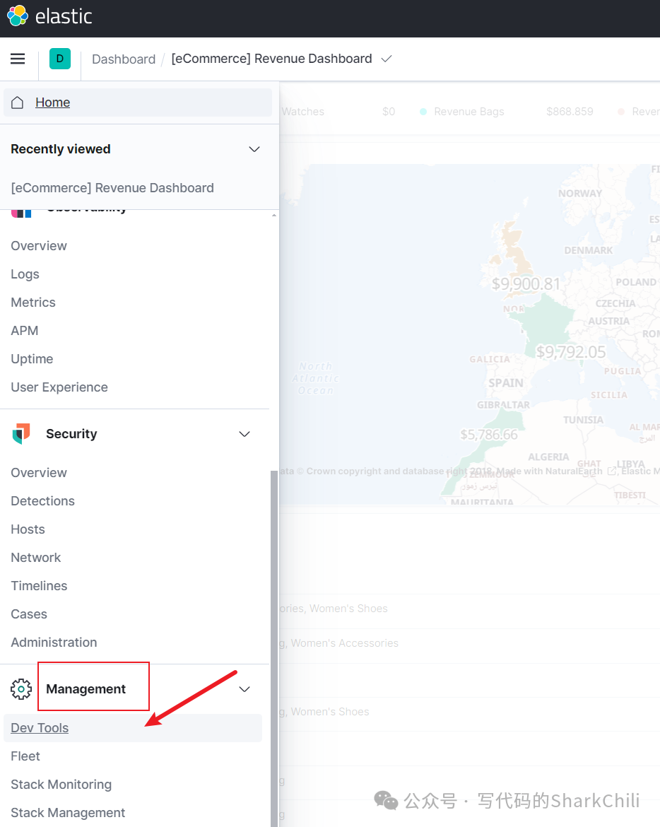 接下来就是正式的介绍Kibana对于ES的操作步骤了,在此之前我们先找到dev tools