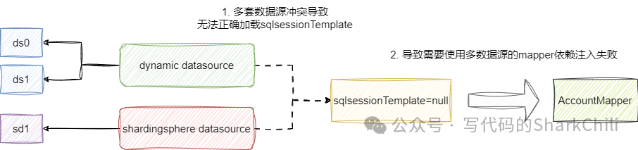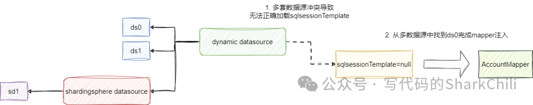 多数据源下的某个数据源,而当前我们却注入了两套数据源,最终导致AccountMapper