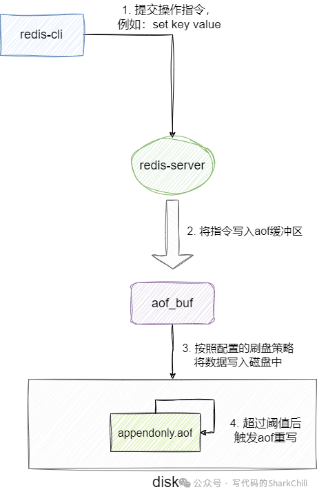 用于将Redis服务器收到的写操作追加到日志文件,通过该机制可以保证服务器重启后依然可以依靠日志文件恢复数据。 它的工作过程大抵分为以下几步: