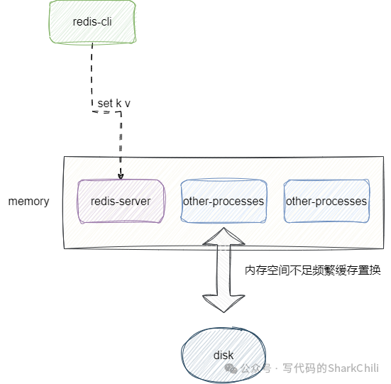 需要补充的是,上面提到日志重写期间数据都会被写到AOF缓冲区中,在高并发场景下也可能导致内存被打满出现频繁内存置换等情况间接导致我们的redis进程阻塞,此时就可能出现读写性能下降的情况: