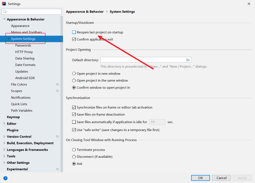 都会开启上一次启动的项目,所以我们需要进入设置找到File | Settings | Appearance & Behavior | System Settings