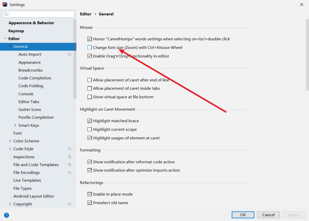 ,然后勾选 Change font size (Zoom) with Ctrl+Mouse Wheel