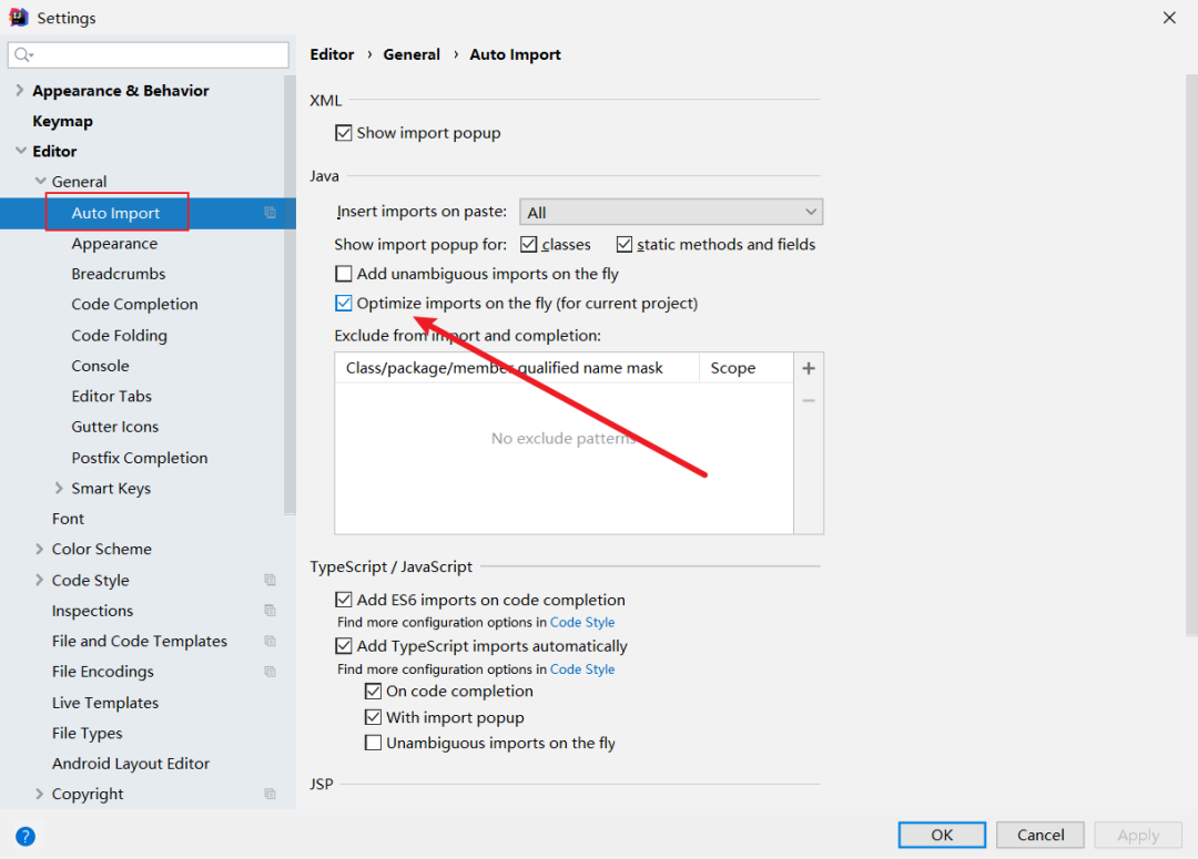 即可找到自动引包的配置界面,勾选Optimize imports on the fly (for current project)