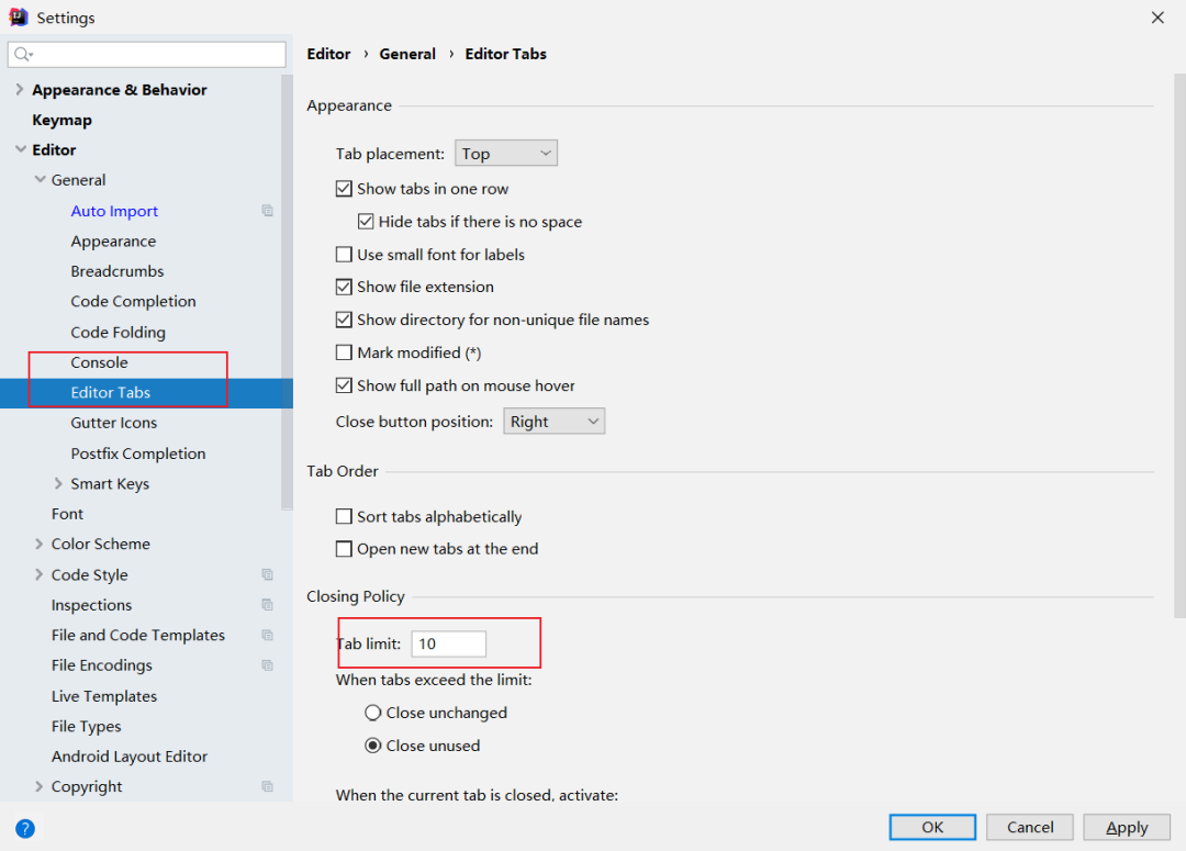 设置界面选择File | Settings | Editor | General | Editor Tabs