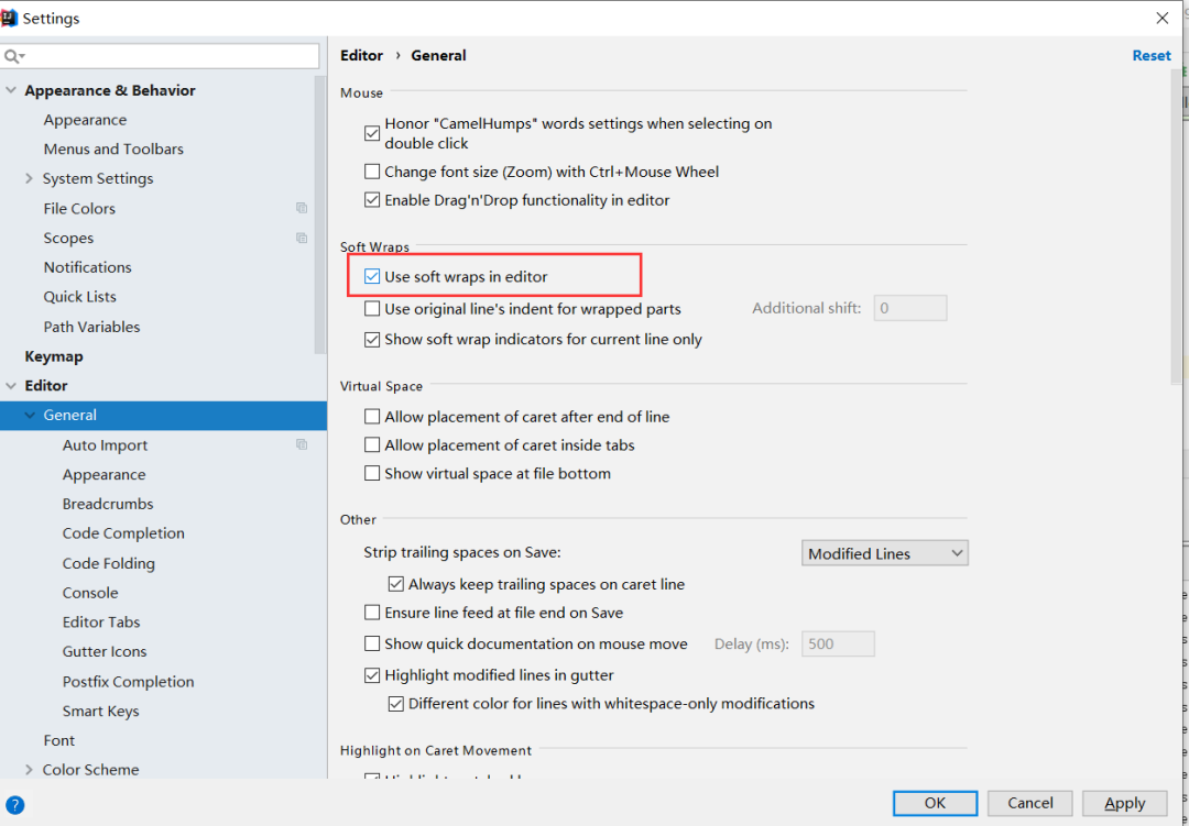 如果希望编码过程中代码对那些溢出屏幕的代码换行显示的话,可以通过File | Settings | Editor | General