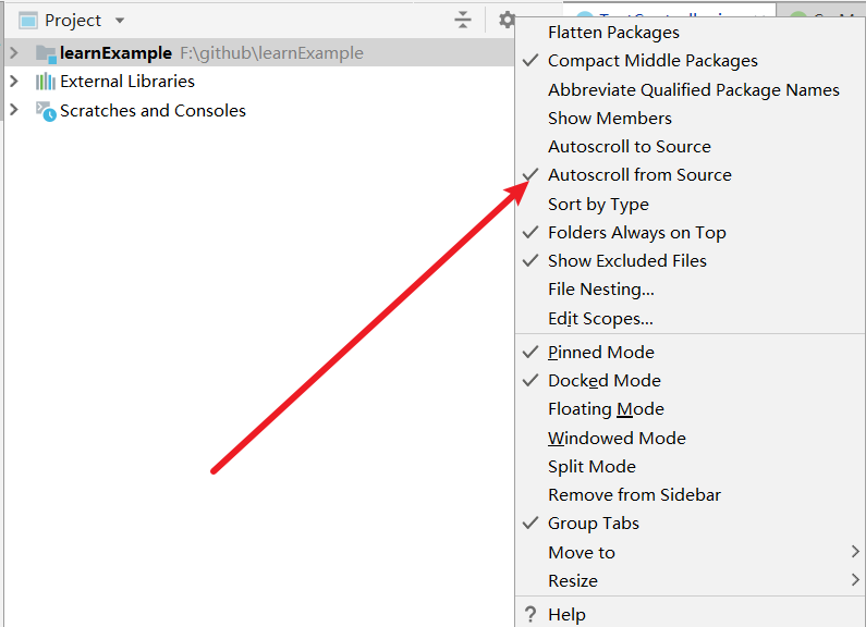 如果希望点击tab栏上的一个文件时,左侧的项目文件结构会跟随移动,我们可以勾选下图所示的选项: