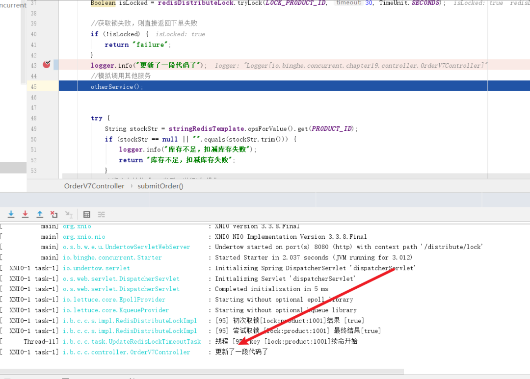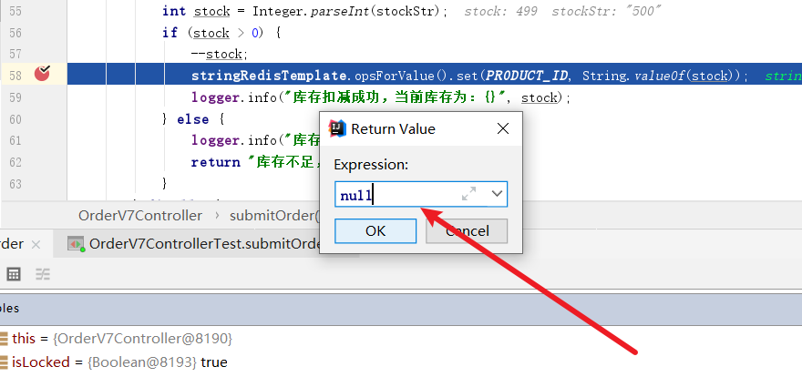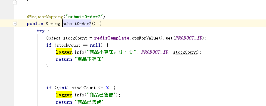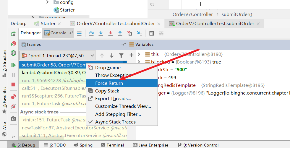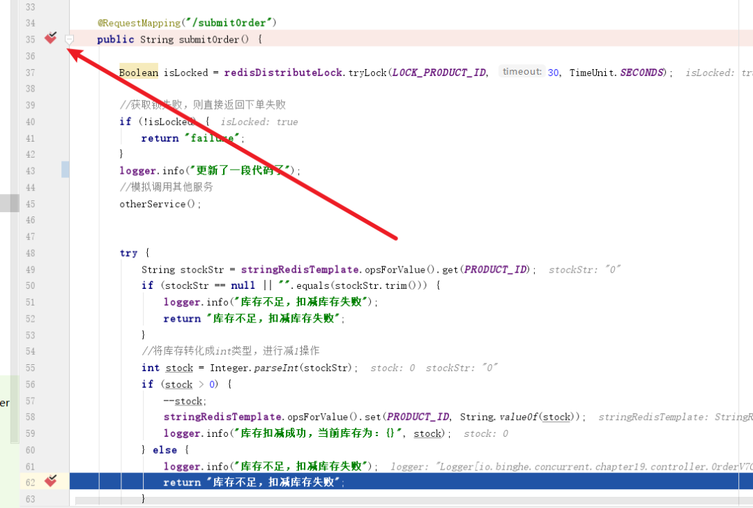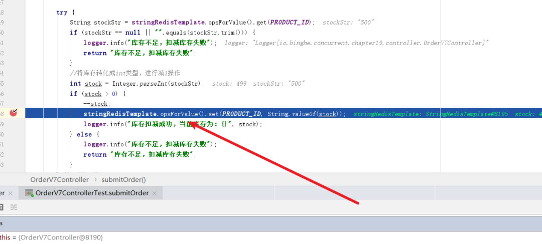 有时候我们希望调试过程中已经知道了bug所在,希望代码不在继续执行去操作资源,例如下面这段代码就会操作redis数据,有些读者可能会用强制停止应用的方式结束,某些情况下这种方式还是会操作资源