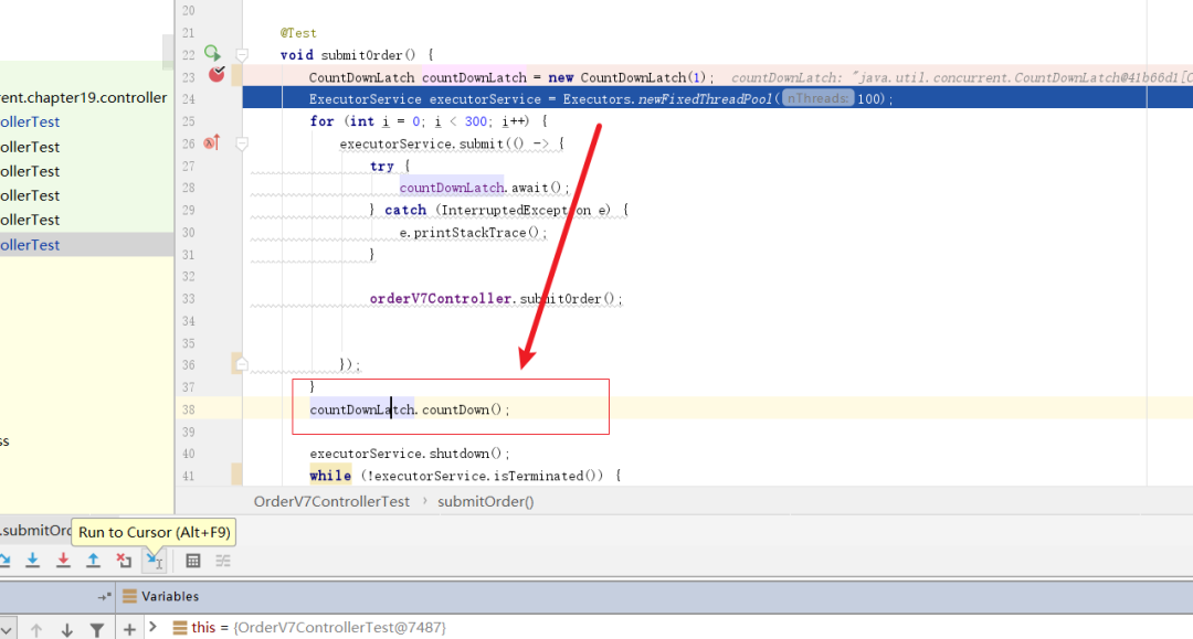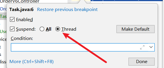也不会一口气执行完,而是一个个线程经过断点再结束: