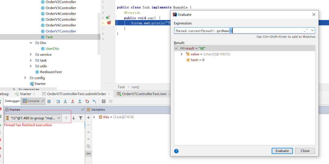 我们手动将调整为t3,结果当前执行线程没有发生任何变化: