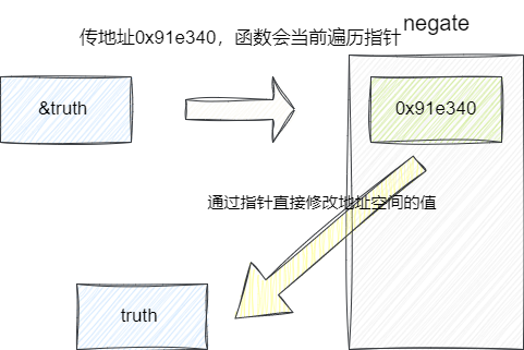 让函数得到变量指针。 通过指针访问实参地址。 取反并赋值。