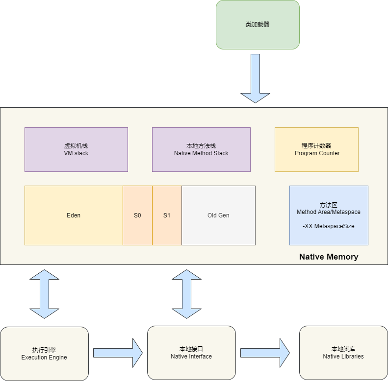 所以JDK8版本的内存结构最终如下图所示,这也就意味着「JDK7」版本对永久代的设置参数「(-XX:MaxPermSize)」 变为无效参数,取而代之的是对元空间空间大小设置的参数「(-XX:MetaspaceSize)」。