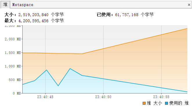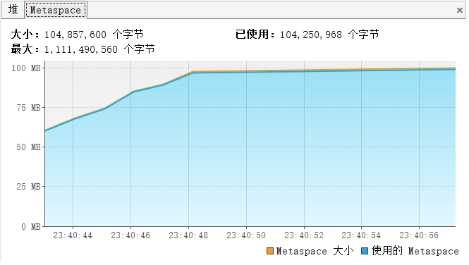 再来看看元空间,可以看到随着实践的推移,无数个全新的代理类的信息存到元空间,因为元空间不受GC管理,所以使用内存不断增加: