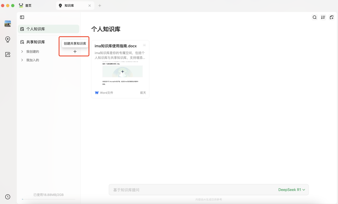 创建共享知识库(共享知识库可以设置权限:仅自己可见、发布到广场、通过共享链接/二维码访问)