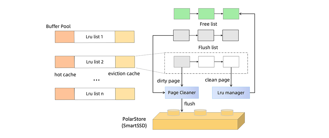 对于 I/O 密集型的负载,为了减少关键 page 淘汰和频繁移动数据页位置带来的锁开销,PolarDB 在 LRU 链表的头部建立 hot cache list,对于特定 page(索引中间页,元数据页)和根据频率识别的热点表会被优先放入 hot cache,减少淘汰频率。