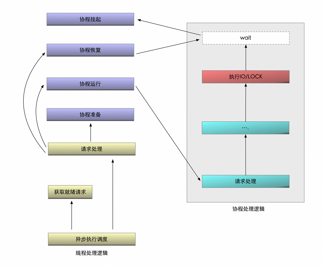 请求协程化:事务请求被封装为独立协程,由用户态调度器管理。