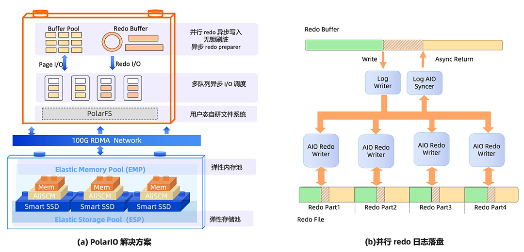 PolarDB 针对 IO 链路提出了一套 PolarIO 解决方案,如图 9 (a) 所示,从存储引擎 Page 和 Redo I/O 两大主要类型出发, 对 Buffer Pool,Redo buffer,I/O 队列进行改造,最后通过自研用户态文件系统 PFS ,持久化到底层的弹性存储中。