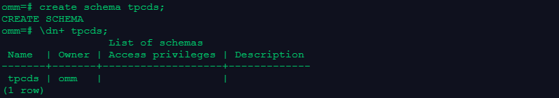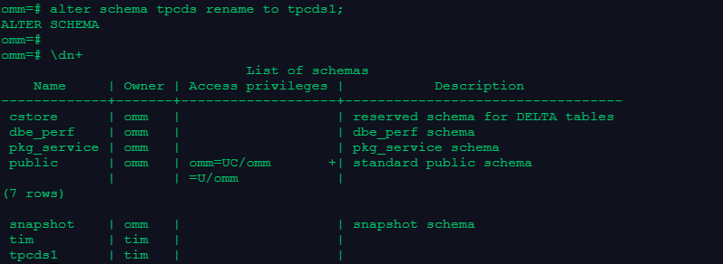 2.创建一个用户tim, 并将tpcds的owner修改为tim,且修改owner前后分别使用\dn+查看模式信息