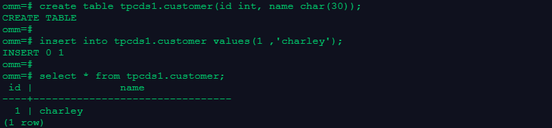 4.在模式tpcds1中建表customer、插入记录和查询记录