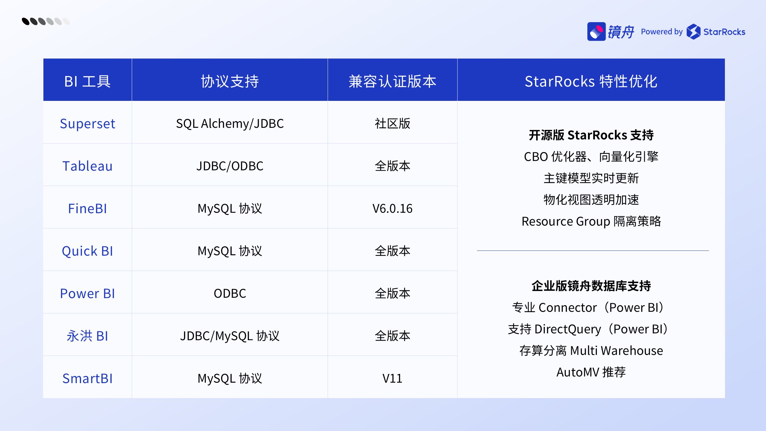 - MySQL 协议兼容:StarRocks 支持通过 JDBC/ODBC 连接,能够无缝对接主流 BI 工具;