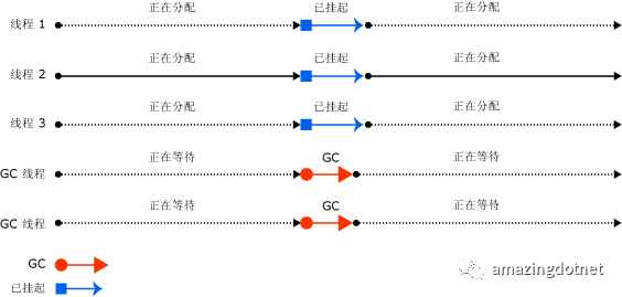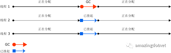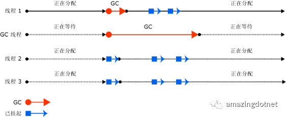 下图演示了触发垃圾回收并导致其他线程挂起的线程。