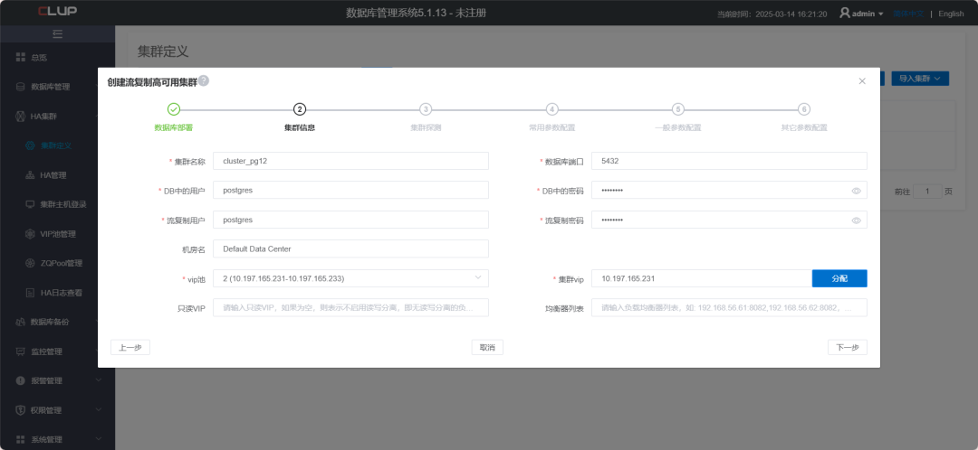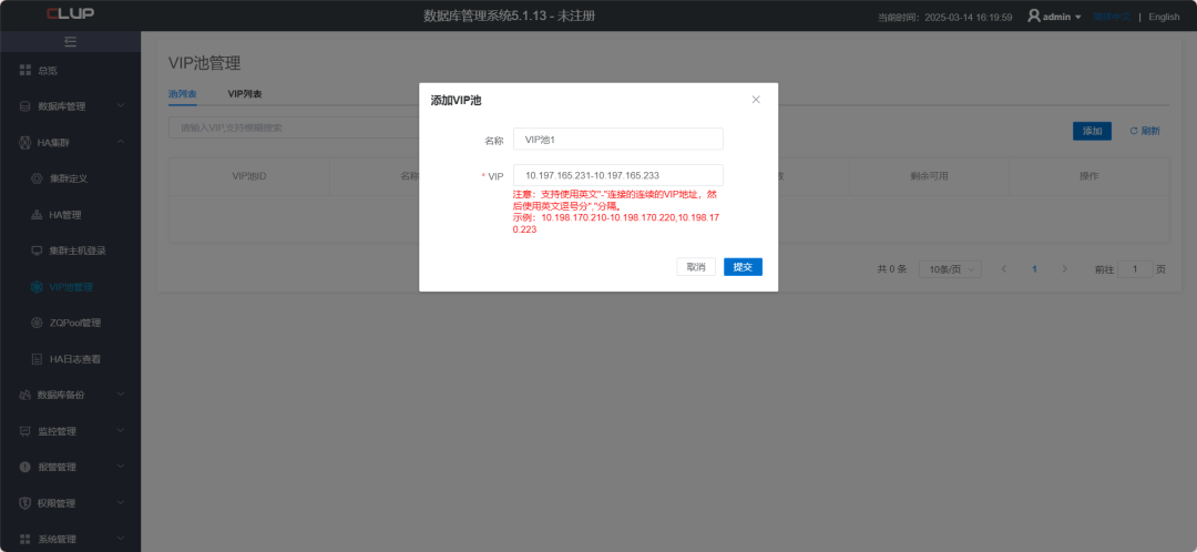 进入主界面,在创建数据库集群之前,需要先创建一个VIP池。点击HA集群->VIP池管理->添加。填写VIP池的名称和VIP即可创建成功。