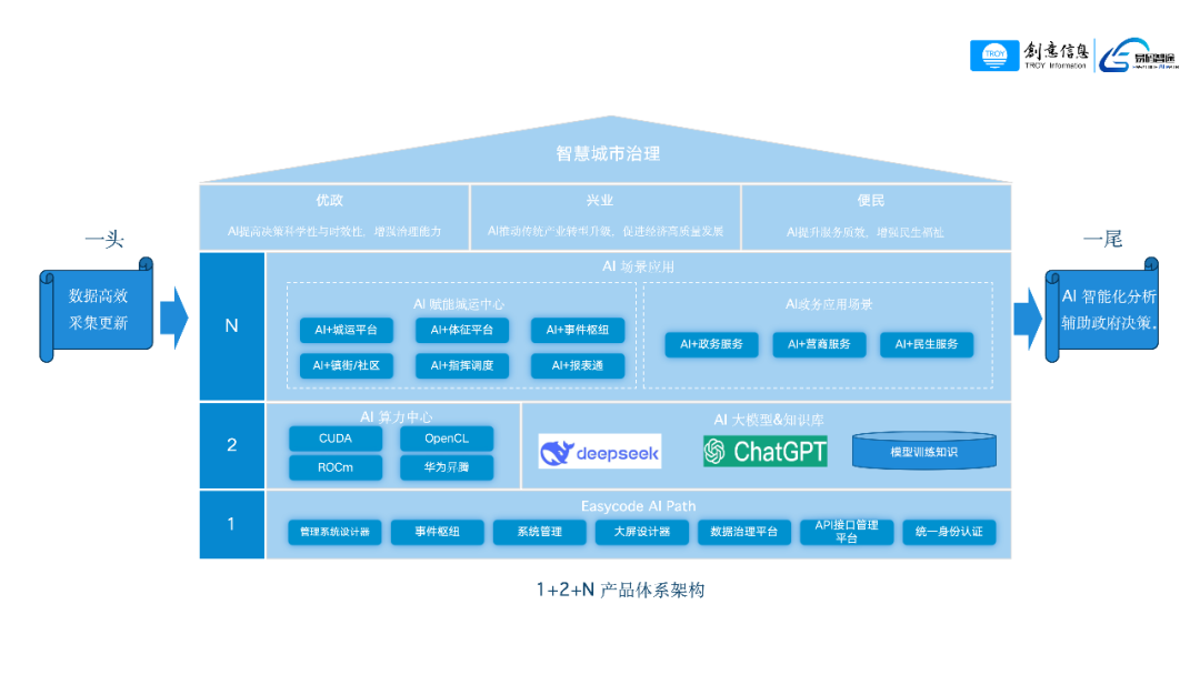 具体而言,该体系围绕“1+2+N”架构,以EAP为底座,利用华为昇腾、OpenCL等AI算力中心,以及Deepseek、ChatGPT等大模型和知识库,实现实时流数据的在线学习,构建AI原生的数据架构,快速生成、调优与部署算法模型。通过“七步逻辑推衍法”,最终赋能AI+城运平台、体征平台、政务服务等N个应用场景,精准满足用户需求。
