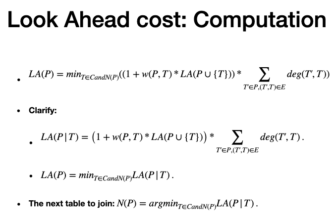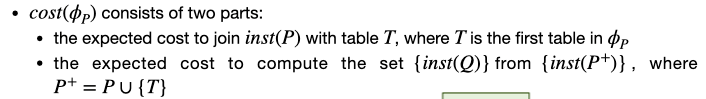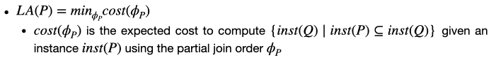 AJOSC利用动态规划,结合专为连续多表连接设计的新代价模型,寻找最优连接顺序。 新代价模型提出了LA cost。对于每一个子查询P,LA(P)是,按照最优顺序使用P的一个实例来计算包含该实例的查询结果的期望cost。