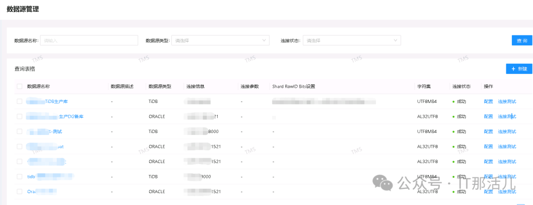 在数据源页面点击新增按钮,按提示添加数据库连接,其中页面底部字符集为必填项,点击保存时会校验是否与数据库实际字符集一致。在保存完成后,页面回到数据源列表界,可以点击“连接测试”测试连通性。