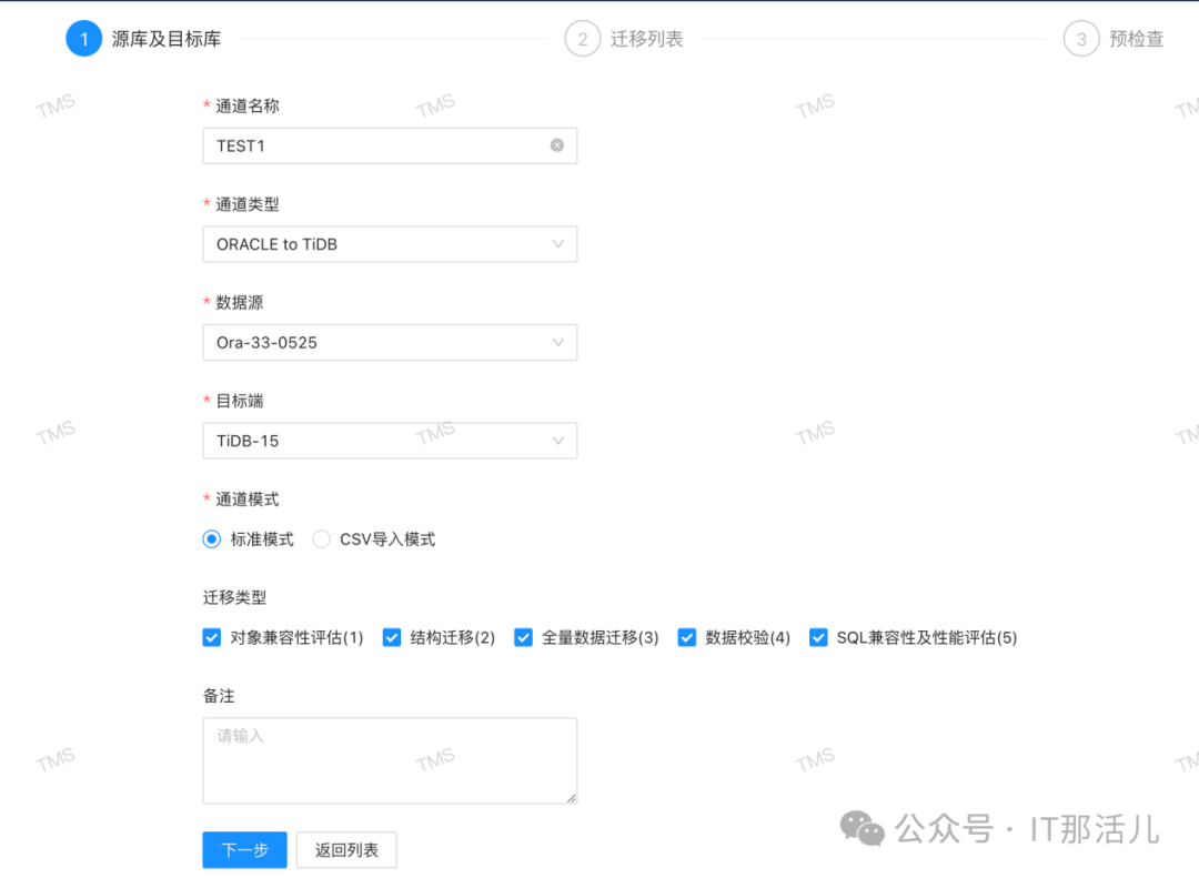 选择通道类型、数据源、目标端。通道模式选择“标准模式”,勾选“迁移类型”。