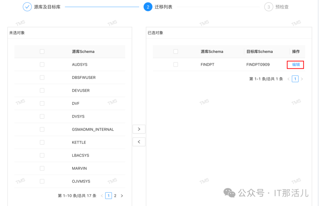 选择迁移schema,在右侧“已选对象”列表中,点击“编辑”,可以对已选schema重命名。