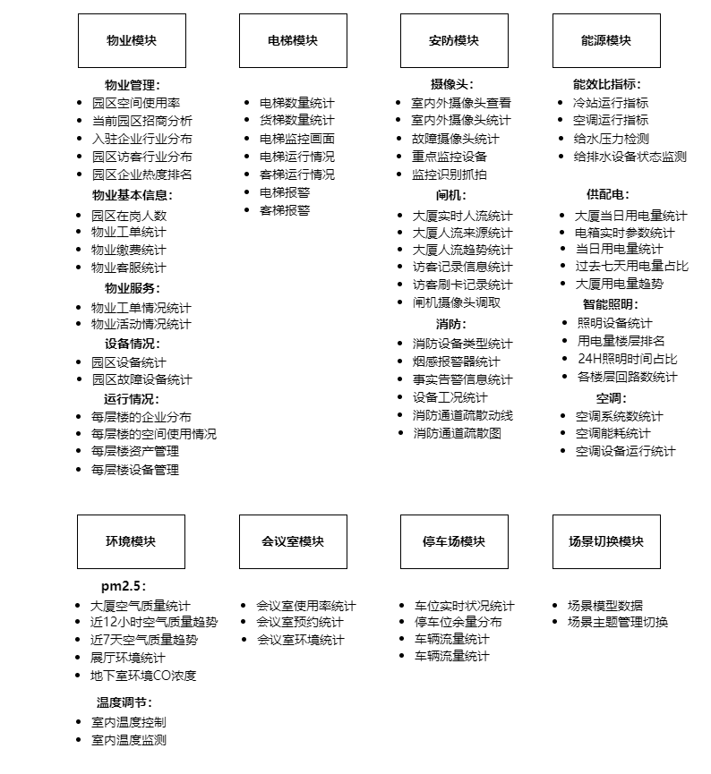 智慧园区以管理服务平台为数据支撑,通过三维场景展示园区模型,同时将园区事件管理、流程管理、设备资产管理、运营维护管理、能源管理、物业管理、应急管理等功能模块叠加在CIM模型上,通过三维可视化的方式向管理人员提供直观的管理手段。