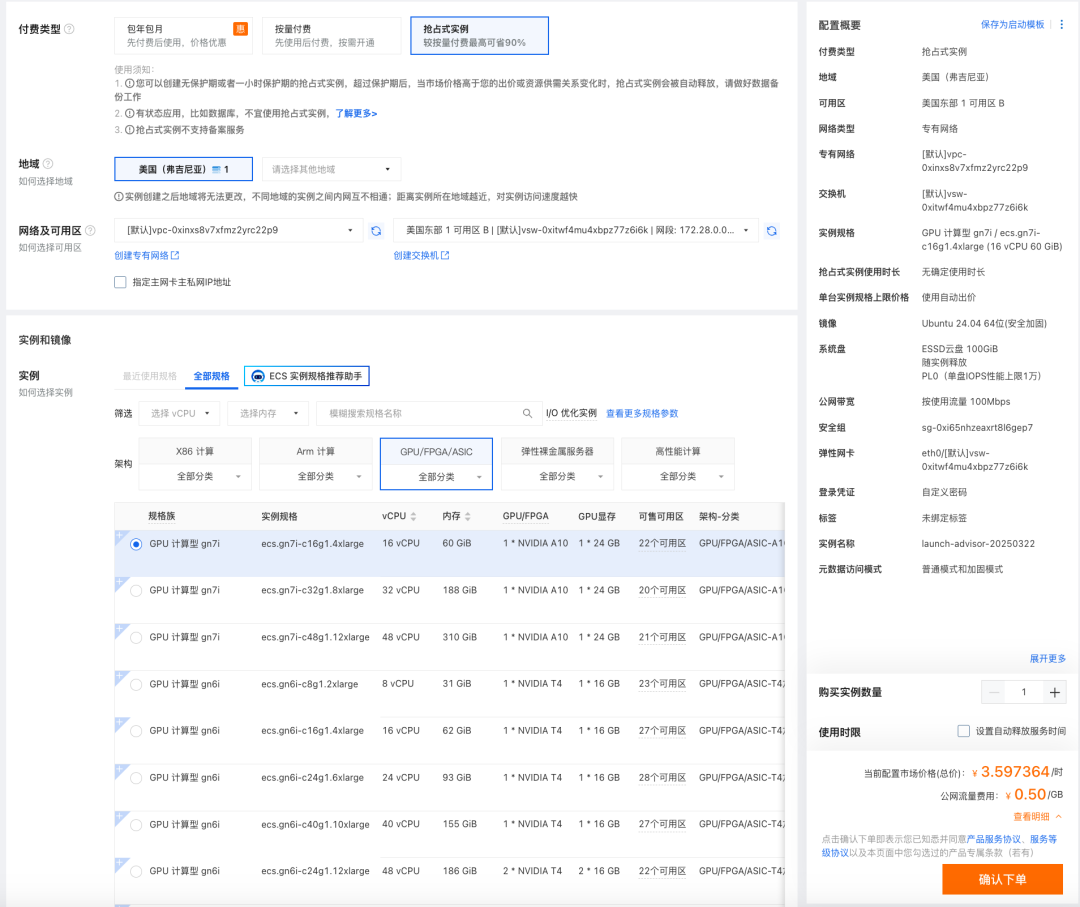如果你在本地没有 GPU 服务器,也可以考虑在云服务提供商购买,比如阿里云、AWS、Azure 等。我个人觉得在阿里云上购买 GPU 实例的价格相对更实惠,不同地域的价格也有所差异,例如美国区域通常会更便宜一些。如果选择抢占式实例,价格还能进一步降低,非常适合用于开发测试等对稳定性要求不高的场景。