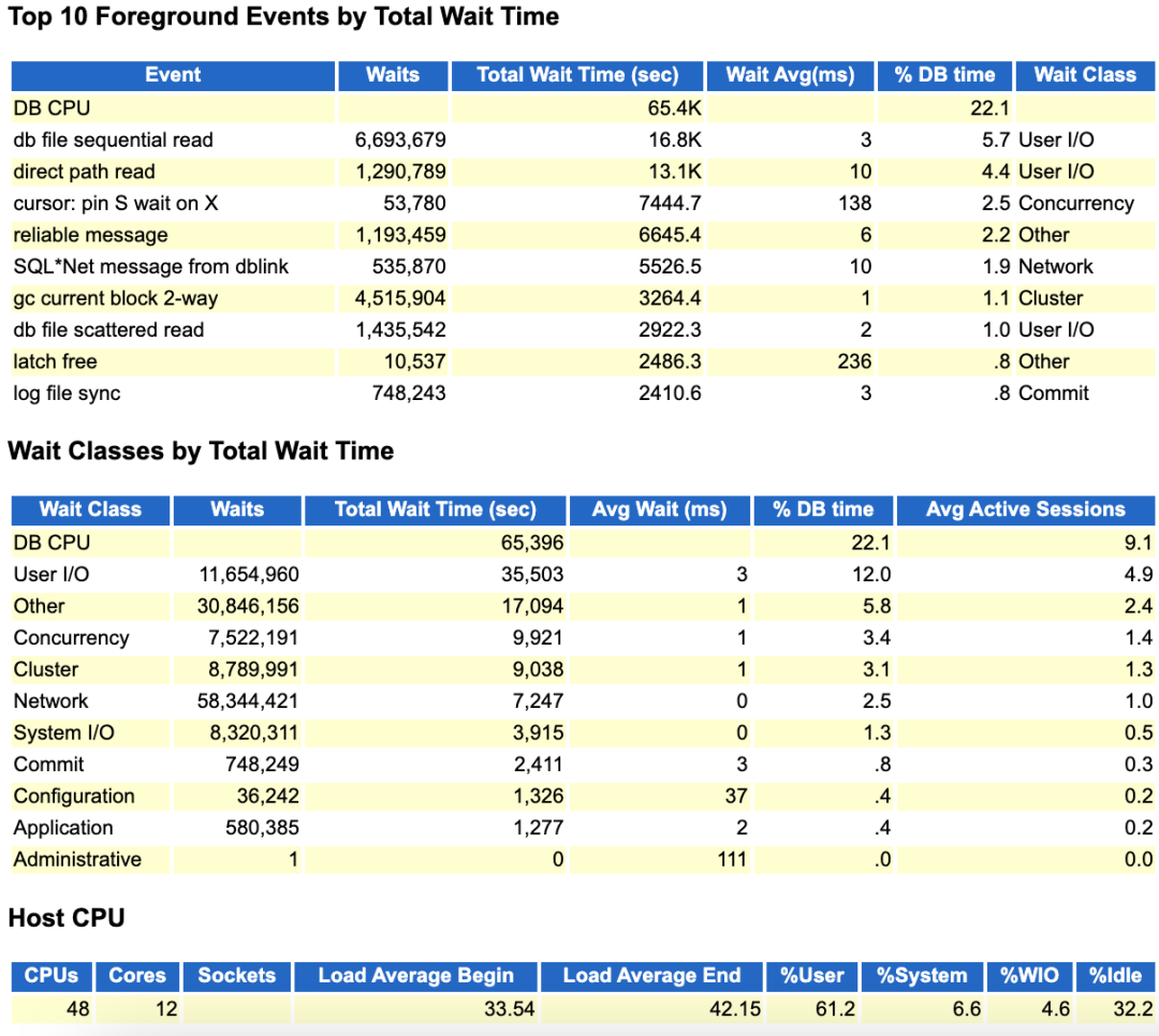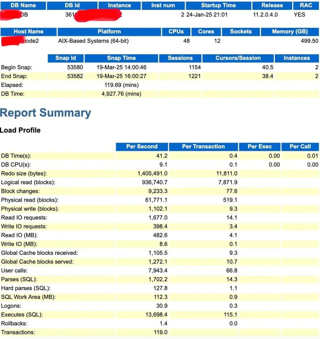 我们通常习惯于通使用DB Time来判断一个系统负载的高低,比如这里单节点48c,意味着cpu的处理能力是48*120=5760(mins),而当前DB time是4927min,已经比较接近了,说明负载较高。