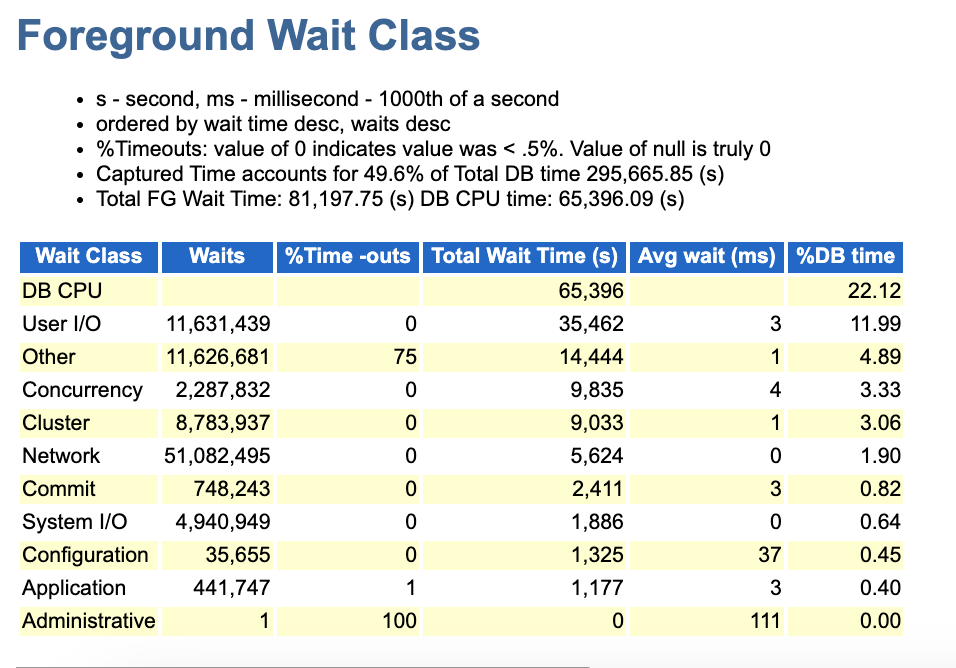 因此我们不能单纯的看 DB CPU + Foreground Wait Events很低,就认为一定是OS的cpu处理能力不足,需要扩容CPU;尽管看上去cpu wait指标也不低。