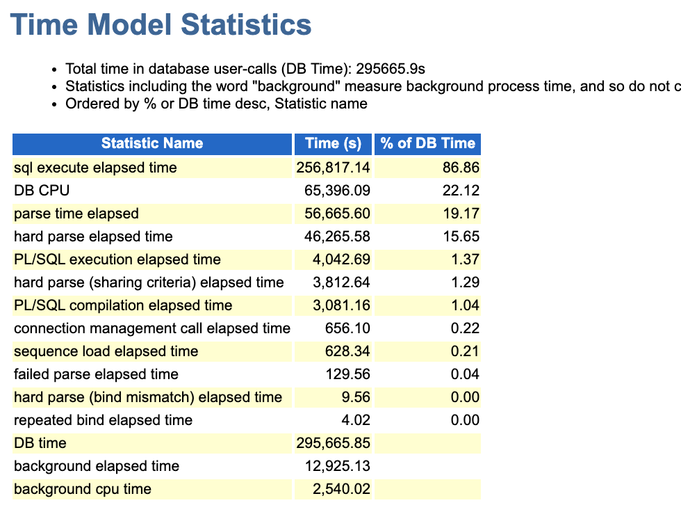 从整个DB time model的数据来看,DB time 一共是29万秒,其中sql execute elapsed time 高达256817万秒。不难看出SQL本身的执行就消耗绝大部分时间,其解析就消耗了56665秒,高达19%,这也是非常高的。