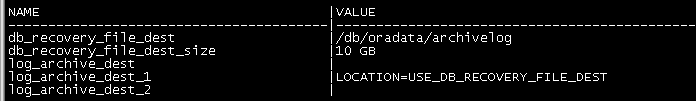 select name,value from v$parameter where name like 'db_recovery_file_dest' or name='log_archive_dest' or name='log_archive_dest_1' or name='log_archive_dest_2'