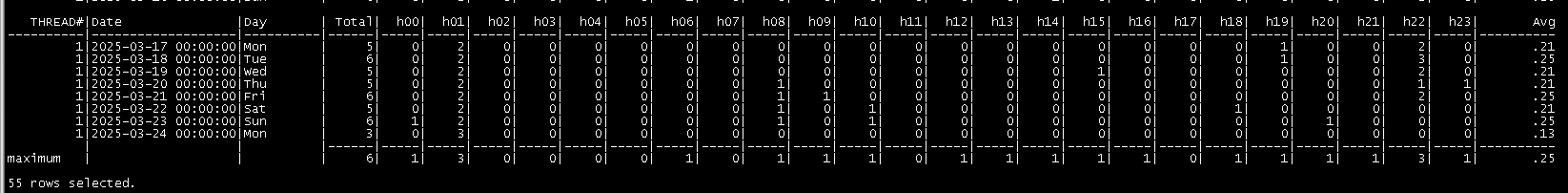 SELECT thread#,TRUNC(first_time) "Date",TO_CHAR(first_time, 'Dy') "Day",COUNT(1) "Total",