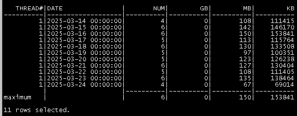 select THREAD#, trunc(completion_time) as "DATE",count(1) num,trunc(sum(blocks*block_size)/1024/1024/1024) as GB,trunc(sum(blocks*block_size)/1024/1024) as MB,