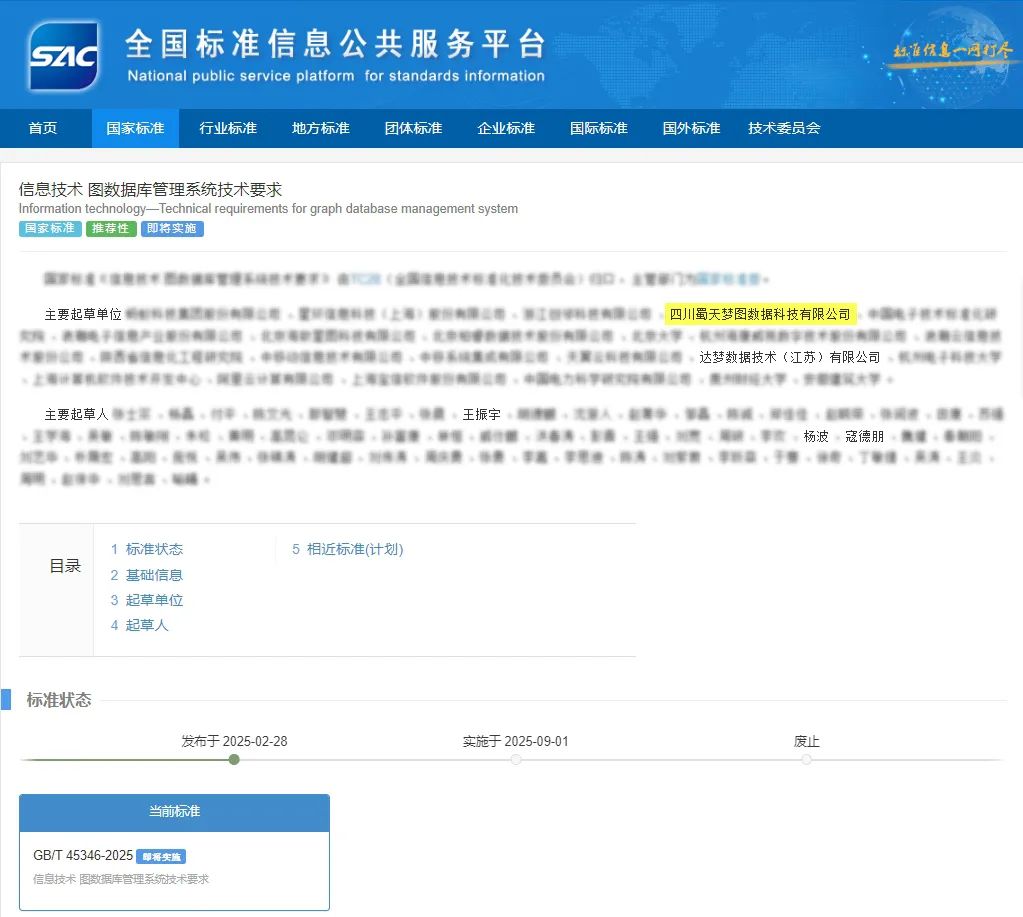 2025年2月28日,国家市场监督管理总局、国家标准化管理委员会发布的中华人民共和国国家标准公告(2025年第4号),《信息技术 图数据库管理系统技术要求》国家标准正式发布,并将于2025年9月1日正式实施。这是我国图数据库领域首个国家级技术标准,标志着国产图数据库技术发展迈入规范化、体系化新阶段!