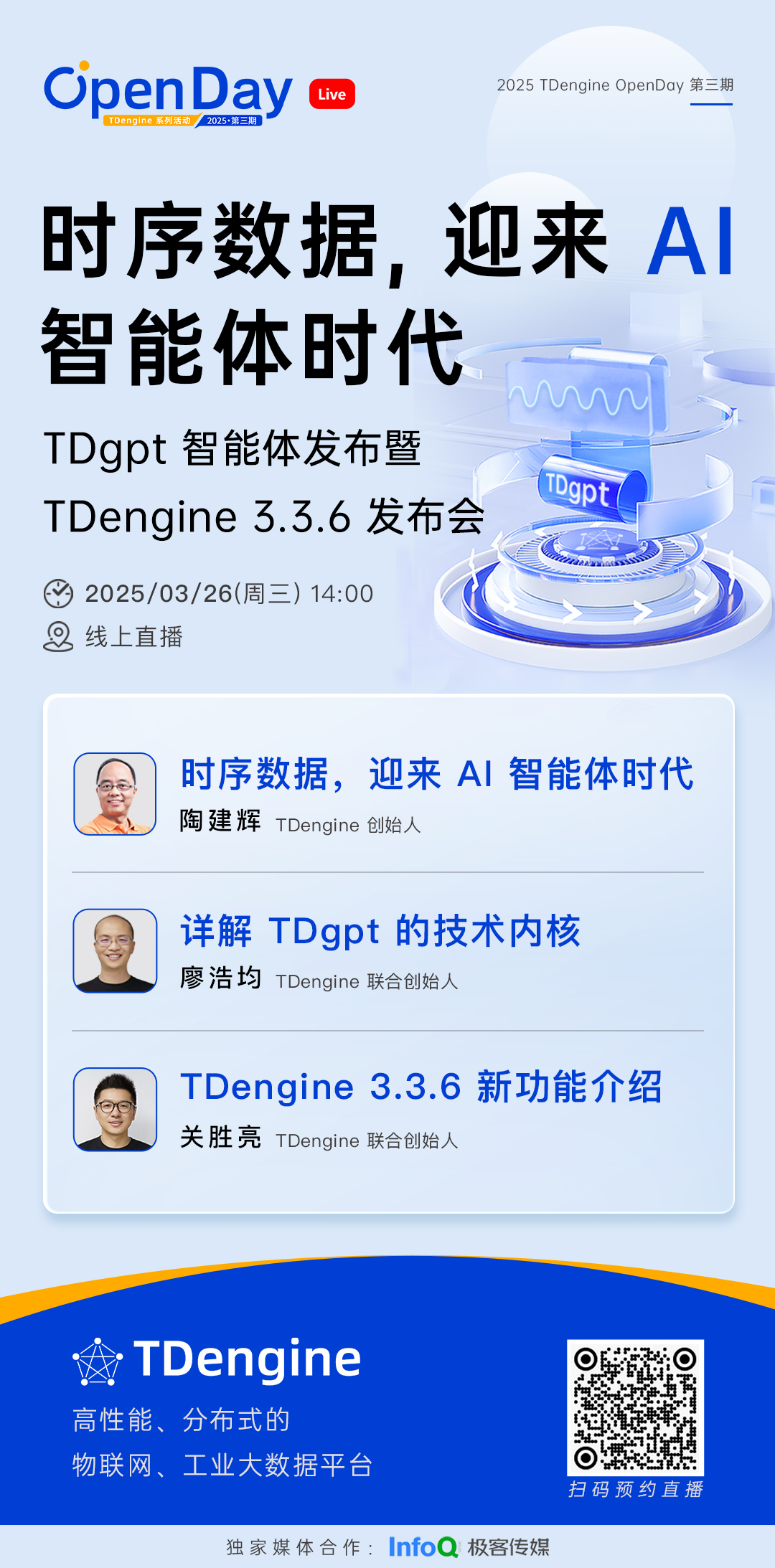 TDgpt 是 TDengine 内置的时序数据分析 AI 智能体,具备预测、异常检测、缺失补齐、数据分类等核心能力。它能无缝对接各种时序基础模型、大语言模型、机器学习以及传统统计算法,并支持算法动态切换。用户只需通过一条 SQL 语句,即可在熟悉的数据库环境中调用强大的 AI 分析能力,无需复杂配置、无需数据迁移。此外,TDgpt 还开放了 SDK,开发者可以将自研算法或模型轻松集成到 TDengine 生态中,直接服务于实际业务场景。在即将到来的直播中,我们邀请了 TDengine 创始人及核心技术团队成员,带来三大重磅内容分享:👨💼 TDengine 创始人陶建辉:聊聊“AI 智能体时代”,时序数据的新使命🧠 TDengine 联合创始人廖浩均:带你一探 TDgpt 的“大脑”结构,技术细节全揭秘🛠 TDengine 联合创始人关胜亮:介绍 TDengine 3.3.6 新版本的功能升级,更新不止一点点我们相信,无论你是关注数据库前沿技术的开发者,还是希望将 AI 引入业务分析流程的行业从业者,一定都能在这场直播中获得启发。感兴趣的小伙伴可扫描上方海报二维码,或点击下方 TDengine 官方视频号卡片进行直播预约观看。从数据存储,到智能分析,TDengine 正在不断突破数据库的边界。TDgpt 的诞生,不仅让 AI 能力原生嵌入数据库,更让时序数据真正“活”起来——能看、能说、能思考。3 月 26 日(本周三)下午 2 点,锁定直播间,和我们一起见证 TDengine 与 AI 的深度融合,迎接时序数据的智能体时代!👇 点击阅读原文,立即体验 TDengine!