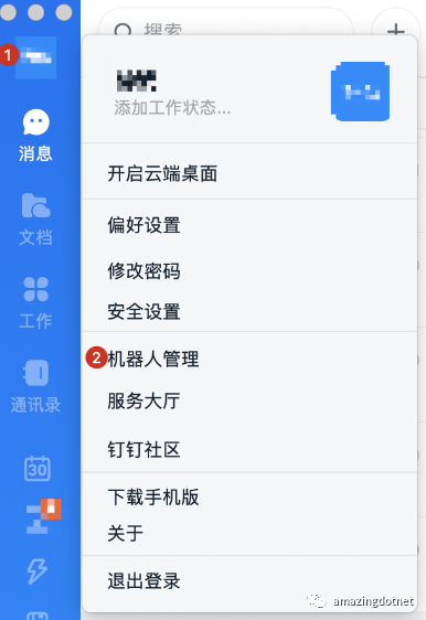 打开机器人管理页面。以PC端为例,打开PC端钉钉,点击头像,选择机器人管理。